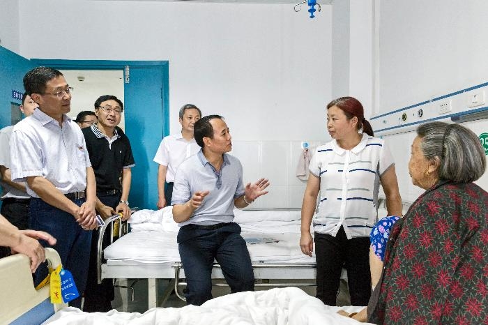 王培安副主任在光山县人民医院病房与贫困户亲切交谈