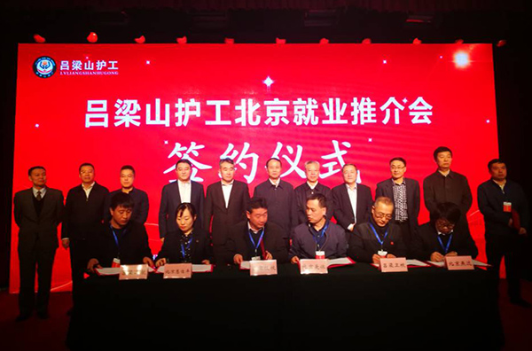 会上,吕梁市人民政府分别与北京家政服务协会、中国医院协会后勤管理委员会签订吕梁山护工就业合作协议;吕梁山护工培训学校分别与北京家政公司、养老陪护机构签订就业合作协议,与此同时,吕梁家政公司也与北京家政公司签订了劳务合作协议。