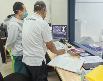 第二批援基里巴斯医疗队放射科医生指导当地医生进行CT检查。第二批援基里巴斯医疗队供图