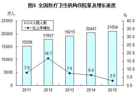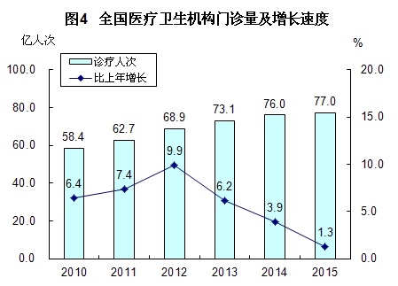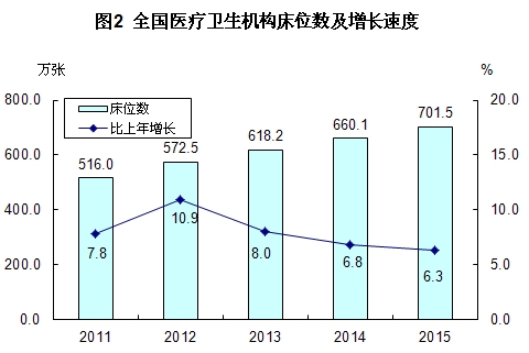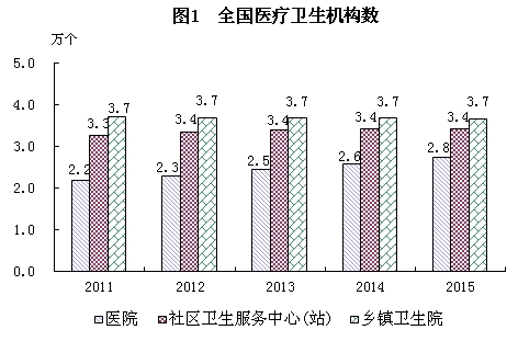 (一)医疗卫生机构总数。2015年末,全国医疗卫生机构总数达983528个,比上年增加2096个。其中:医院27587个,基层医疗卫生机构920770个,专业公共卫生机构31927个。与上年相比,医院增加1727个,基层医疗卫生机构增加3435个,专业公共卫生机构减少3102个(由于资源整合,计划生育技术服务机构减少)(见表1)。