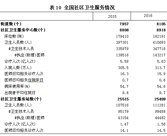 (二)社区医疗服务。2016年,全国社区卫生服务中心诊疗人次5.6亿人次,入院人数313.7万人,医疗服务量比上年增加(见表10);平均每个中心年诊疗量6.3万人次,年入院量352人;医师日均担负诊疗15.9人次和住院0.6日。2016年,全国社区卫生服务站诊疗人次1.6亿人次,平均每站年诊疗量6139人次,医师日均担负诊疗14.5人次。
