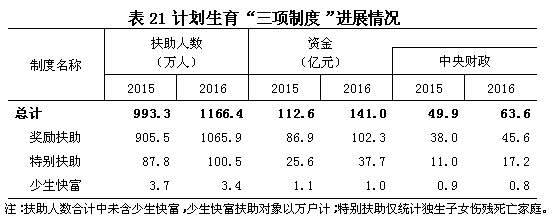 (三)计划生育家庭奖励和扶助政策。2016年计划生育家庭奖励和扶助“三项制度”共投入资金141亿元,比上年增加28.4亿元;农村计划生育家庭奖励扶助制度受益1065.9万人,计划生育家庭特别扶助制度独生子女伤残死亡家庭受益100.5万人,西部地区“少生快富”工程受益3.4万户。