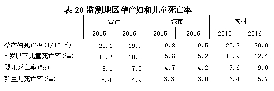 (三)孕产妇死亡率。据妇幼卫生监测,2016年,孕产妇死亡率为19.9/10万,其中:城市19.5/10万,农村20.0/10万。与上年相比,孕产妇死亡率有所下降(见表20)。城市孕产妇主要死因构成:产科出血占19.7%、羊水栓塞占8.5%、妊娠期高血压疾病占2.8%、合并心脏病占12.7%;农村孕产妇主要死因构成:产科出血占26.1%、羊水栓塞占11.4%、妊娠期高血压疾病占9.5%、合并心脏病占9.0%。