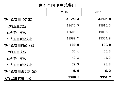 (四)卫生总费用。据初步核算,2016年全国卫生总费用预计达46344.9亿元,其中:政府卫生支出13910.3亿元(占30.0%),社会卫生支出19096.7亿元(占41.2%),个人卫生支出13337.9亿元(占28.8%)。人均卫生总费用3351.7元,卫生总费用占GDP百分比为6.2%。