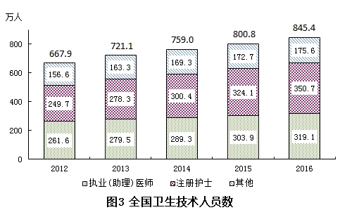 2016年末卫生人员总数中,卫生技术人员845.4万人,乡村医生和卫生员100.0万人,其他技术人员42.6万人,管理人员48.3万人,工勤技能人员80.9万人。卫生技术人员中,执业(助理)医师319.1万人,注册护士350.7万人。与上年比较,卫生技术人员增加44.7万人(增长5.5%),其他人员数见表2。