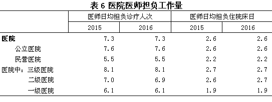 (二)医院医师工作负荷。2016年,医院医师日均担负诊疗7.3人次和住院2.6床日,其中:公立医院医师日均担负诊疗7.6人次和住院2.6床日。医院医师日均担负工作量与上年持平(见表6)。