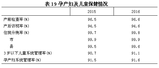 (一)妇幼保健。2016年,孕产妇产前检查率96.6%,产后访视率94.6 %。与上年比较,产前检查率和产后访视率有所提高(见表19)。2016年住院分娩率为99.8%(市99.9%,县99.6%),比上年提高0.1个百分点(市与去年持平,县提高0.1个百分点)。