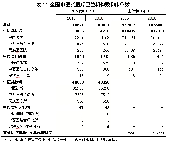 (一)中医类机构、床位及人员数。2016年末,全国中医类医疗卫生机构总数达49527个,比上年增加2986个。其中:中医类医院4238个,中医类门诊部、诊所45241个,中医类研究机构48个。与上年比较,中医类医院增加272个,中医类门诊部及诊所增加2713个(见表11)。