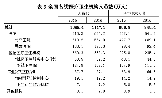 2016年末卫生人员机构分布:医院654.2万人(占58.6%),基层医疗卫生机构368.3万人(占33.0%),专业公共卫生机构87.1万人(占7.8%)。与上年比较,专业公共卫生机构人员总数减少0.6万人(见表3)。