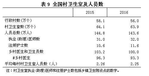 2016年底,全国56.0万个行政村共设63.9万个村卫生室。村卫生室人员达143.6万人,其中:执业(助理)医师32.0万人、注册护士11.6万人、乡村医生93.3万人。平均每村村卫生室人员2.25人。与上年比较,村卫生室数减少0.2万个,人员总数减少1.2万人(见表9)。