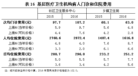 (二)基层医疗卫生机构病人医药费用。2016年,社区卫生服务中心次均门诊费用107.2元,按当年价格比上年上涨9.7%,按可比价格上涨7.6%;人均住院费用2872.4元,按当年价格比上年上涨4.0%,按可比价格上涨2.0%。与2016年相比,门诊费用涨幅上升,住院费用涨幅下降(见表16)。