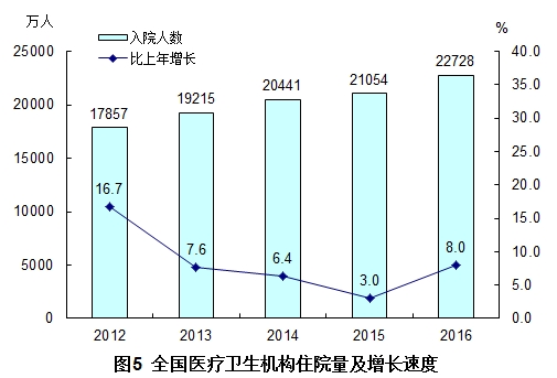 2016年,全国医疗卫生机构入院人数22728万人,比上年增加1674万人(增长8.0%),年住院率为16.5%。