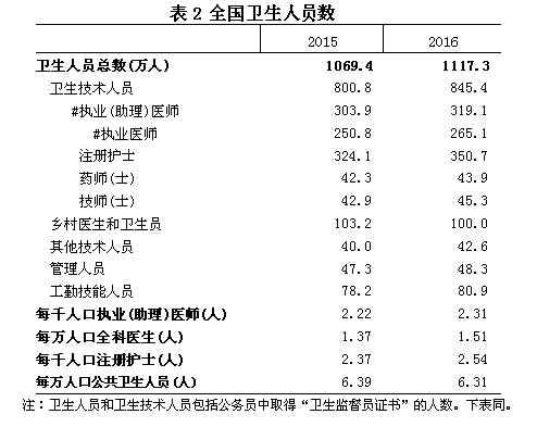 (三)卫生人员总数。2016年末,全国卫生人员总数达1117.3万人,比上年增加47.9万人(增长4.5%)。