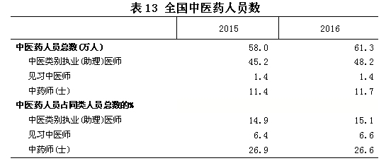2016年末,全国中医药卫生人员总数达61.3万人,比上年增加3.2万人(增长5.6%)。其中:中医类别执业(助理)医师48.2万人,中药师(士)11.7万人。两类人员较上年有所增加(见表13)。