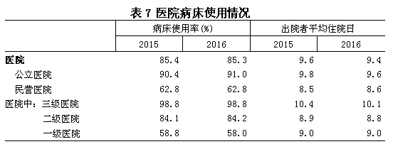 (三)病床使用。2016年,全国医院病床使用率85.3%,其中:公立医院91.0%。与上年比较,医院病床使用率下降0.1个百分点(其中公立医院上升0.6个百分点)。2016年医院出院者平均住院日为9.4日(其中:公立医院9.6日),与上年比较,医院出院者平均住院日下降0.2个百分点。