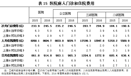 (一)医院病人医药费用。2016年,医院次均门诊费用245.5元,按当年价格比上年上涨5.0%,按可比价格上涨2.9%;人均住院费用8604.7元,按当年价格比上年上涨4.1%,按可比价格上涨2.0%。日均住院费用914.8元,上涨幅度高于人均住院费用2个百分点(见表15)。