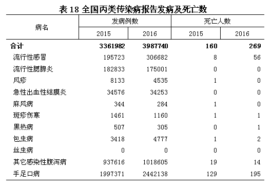 2016年,全国丙类传染病共报告发病398.8万例,死亡269人。报告发病数居前5位的病种依次为手足口病、其它感染性腹泻病、流行性感冒、流行性腮腺炎和急性出血性结膜炎,占丙类传染病报告发病总数的99.7%。报告死亡数较多的病种依次为手足口病、流行性感冒和其它感染性腹泻病,占丙类传染病报告死亡总数的98.5%(见表18)。