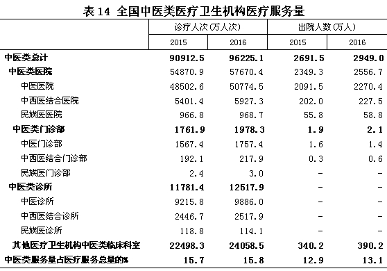 (二)中医医疗服务。2016年,全国中医类医疗卫生机构总诊疗人次达9.6亿人次,比上年增加0.5亿人次(增长5.8%)。其中:中医类医院5.8亿人次(占59.9%),中医类门诊部及诊所1.4亿人次(占15.1%),其他医疗机构中医类临床科室2.4亿人次(占25.0%)。