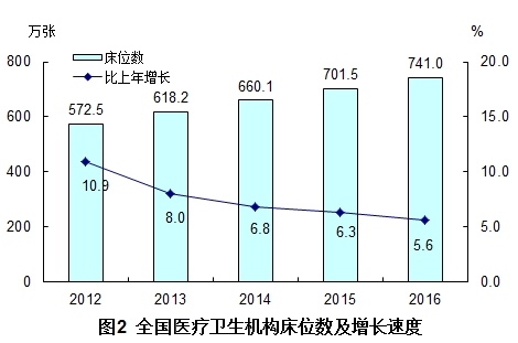 (二)床位数。2016年末,全国医疗卫生机构床位741.0万张,其中:医院568.9万张(占76.8%),基层医疗卫生机构144.2万张(占19.5%)。医院中,公立医院床位占78.3%,民营医院床位占21.7%。与上年比较,床位增加39.5万张,其中:医院床位增加35.8万张,基层医疗卫生机构床位增加2.8万张。每千人口医疗卫生机构床位数由2015年5.11张增加到2016年5.37张。
