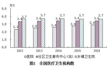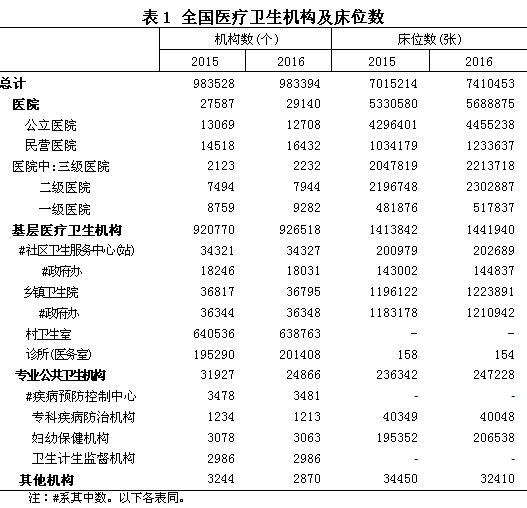(一)医疗卫生机构总数。2016年末,全国医疗卫生机构总数达983394个,比上年减少134个。其中:医院29140个,基层医疗卫生机构926518个,专业公共卫生机构24866个。与上年相比,医院增加1553个,基层医疗卫生机构增加5748个,专业公共卫生机构减少7061个(由于资源整合,计划生育技术服务机构减少)(见表1)。