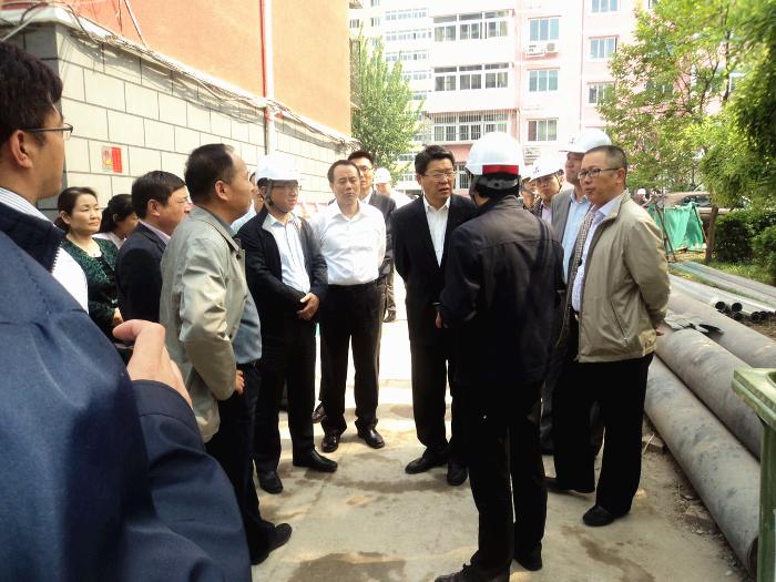 李宝荣、王培安一行对小区居民住宅楼的外檐工程、小区绿化、管道改造等进行了检查,并听取了该工程施工进展、安全质量、文明施工等方面的工作汇报。