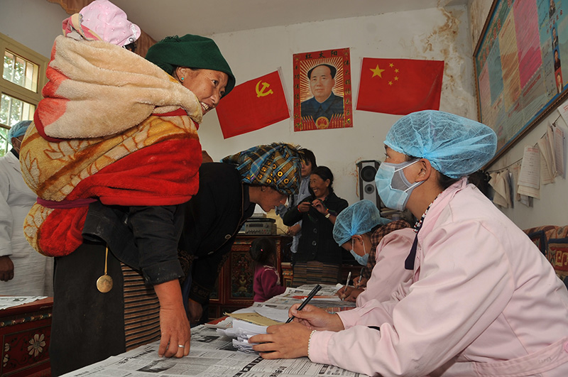 2012年8月20日,西藏拉萨市林周县卡孜乡克布村医务人员义务为当地村民做体检,这是医务人员询问村民身体情况并对检查进行登记