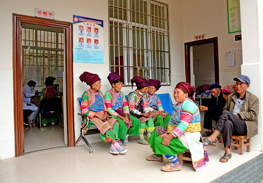 2017年6月30日,云南省大理州巍山县大仓镇新胜村卫生室,乡村医生正在给琢木郎村彝族群众看病。