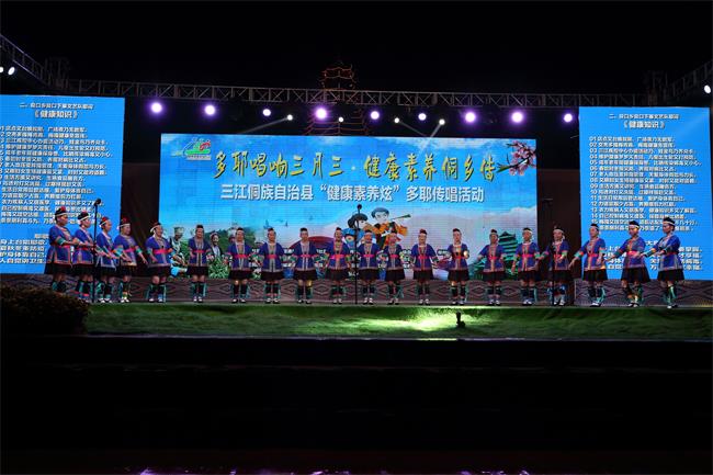 当晚还举行了三江侗族自治县健康素养炫多耶传唱活动,侗乡群众以侗族多耶民歌形式宣传健康素养知识。