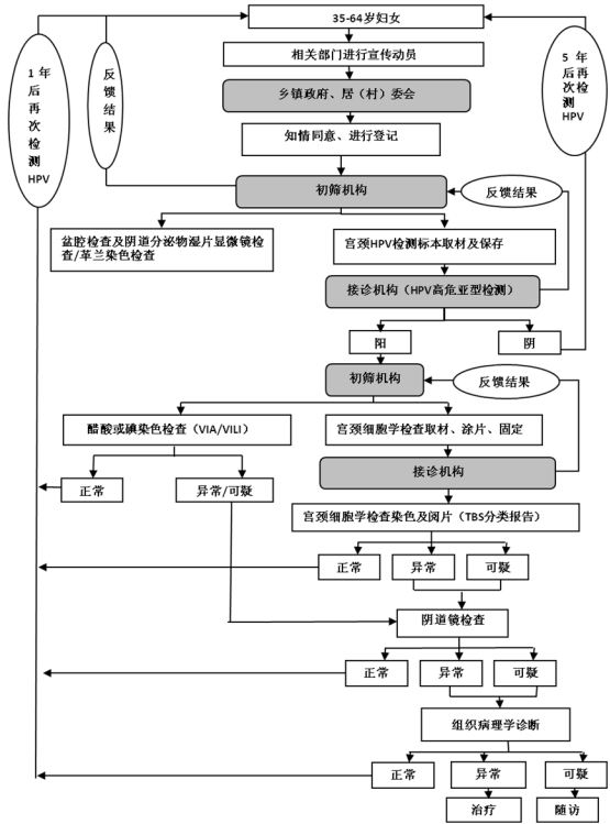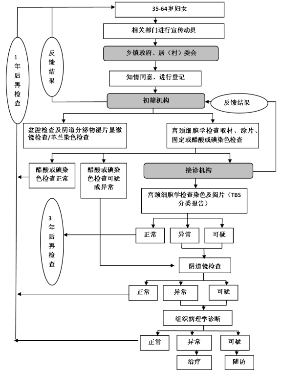 初筛机构主要职责:采集病史、收集临床检查及辅助检查结果,提出医学建议,进行分类指导。对未发现异常情况者,提出定期筛查建议及预防保健指导;对筛查发现异常/可疑者,应当进行追踪随访,并提出进一步检查、诊断或转诊的建议;对筛查发现疾病并已明确诊断者,提出治疗或转诊的建议。在转诊时应当提供转诊对象的基本信息及相关检查资料,填写转诊单。初筛机构不具备细胞涂片染色和阅片能力的,应当将涂片送至指定的接诊机构进行诊断。初筛机构获得接诊机构反馈的结果后,应当在3个月内对异常/可疑病例进行随访,督促其进行进一步检查及治疗,并完成“两癌”检查项目个案登记表填写。