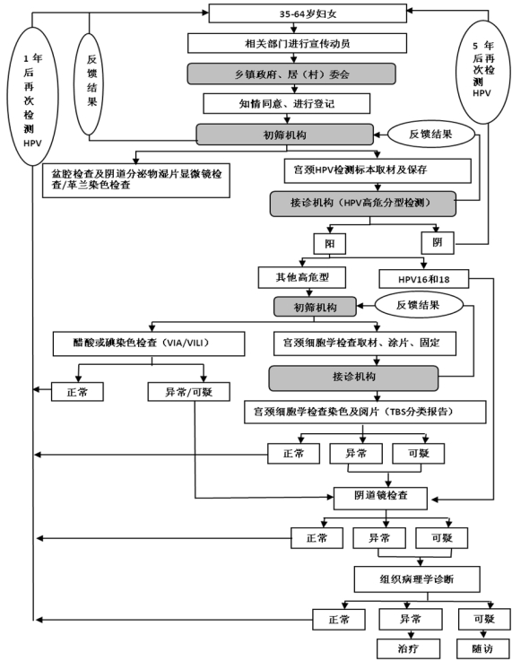 4.组织病理学检查:对阴道镜检查结果异常/可疑者进行组织病理学检查。延续宫颈癌检查项目检查流程图详见附件1。