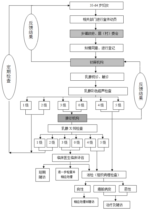 4.对乳腺X线检查0级和3级者应当由副高以上专科医生综合评估后进行随访或活检或其他进一步检查。乳腺癌检查项目检查流程图详见附件4。