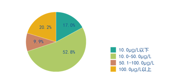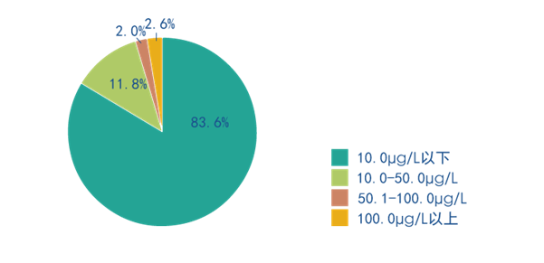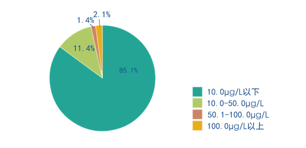 各省份共检测了2936个县的水碘含量,其中水碘含量在10.0μg/L以下的2498个(85.1%);水碘含量在10.0-50.0μg/L之间的336个(11.4%);水碘含量在50.1-100.0μg/L之间的41个(1.4%);水碘含量在100.1-300.0μg/L之间的53个(占1.8%);水碘含量在300.0μg/L以上的8个(0.3%)。见图2。