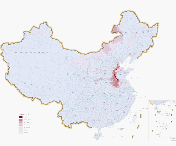 在调查的40325个乡中,水碘含量在10.0μg/L以下的33716个(83.6%);水碘含量在10.0-50.0μg/L之间的4772个(11.8%);水碘含量在50.1-100.0μg/L之间的787个(2.0%);水碘含量在100.1-300.0μg/L之间的878个(2.2%);水碘含量大于300.0μg/L的172个(0.4%)。见图4和附表3。