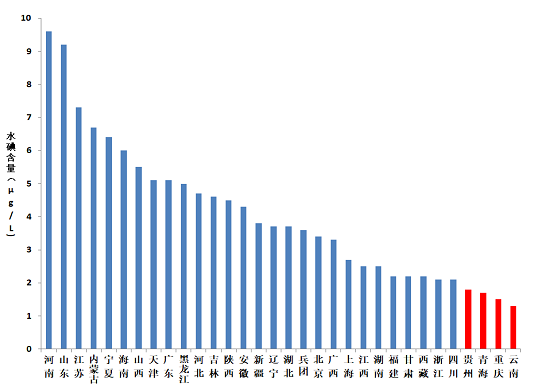北京、江西、海南、重庆、贵州、云南、西藏和甘肃8个省份县级水碘含量均在10.0μg/L以下;四川、湖北、青海、广西、福建、上海、浙江、兵团、新疆、湖南、黑龙江和辽宁等12个省份水碘含量在10.0μg/L以下的县比例大于90%;河北、河南和山东水碘含量在10.0μg/L以下的县比例较低,在70%以下。