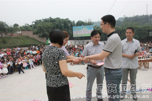 江安县卫生局向夕佳山镇中心幼儿园送慰问金 。(甘艳华 摄)