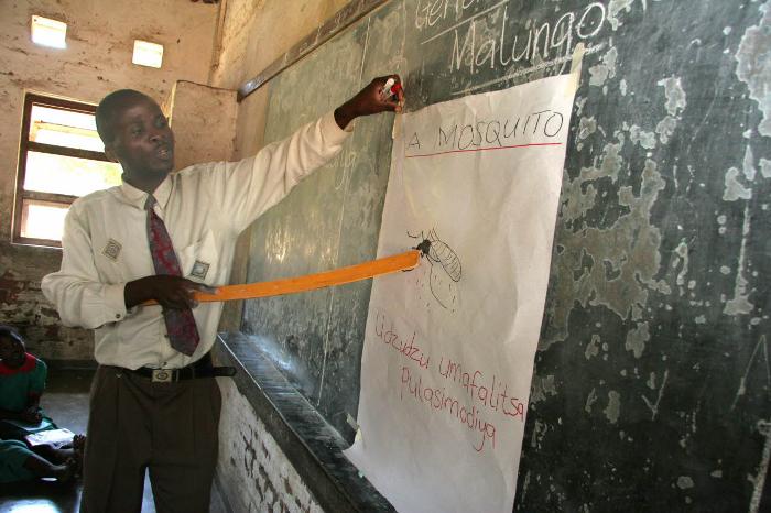 在马拉维,孩子们在课堂上学习关于疟疾和蚊子的知识。一位老师正在讲解蚊子和疟疾的相关知识。(信息来源: