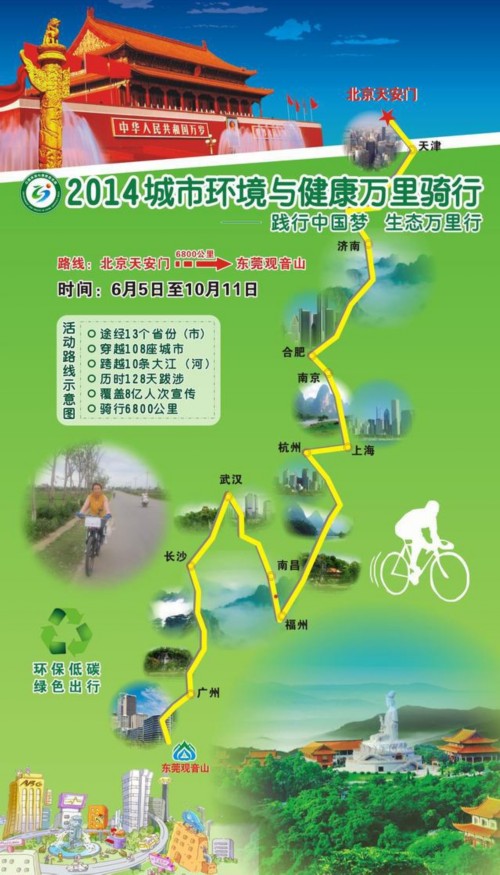 据骑行团领队季晓秋女士介绍:“此次活动的主题为践行中国梦,生态万里行——2014城市环境与健康万里行。活动主要以绿色出行、亲身实践、万里骑行、全国宣传的形式,弘扬生态文明,推广环保理念,倡导健康生活新风尚,宣传“环境保护与健康”精神,以身体力行的环保骑行活动,联动社会各界一起寻求人与自然和谐之道,探索城市健康发展模式,共同发起“共建生态文明、同享碧水蓝天”的倡议,呼吁全社会行动起来,投身到环境保护公益活动当中,为改善城市环境和可持续发展贡献一份心意和力量。”