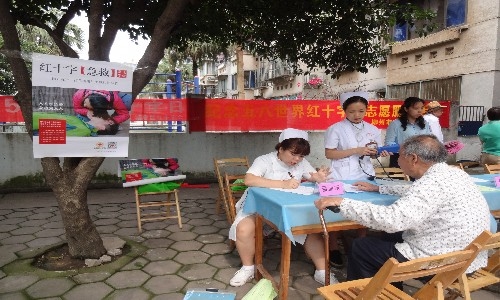 2015年5月9日,城中区红十字会联合、潭中社区卫生服务中心、潭东社区在峻岭厂小区开展主题宣传活动。围绕2015年主题“关爱生命——红十字在行动”,通过张贴海报、悬挂横幅、发放宣传册、健康咨询、义诊等形式向小区居民宣扬红十字会人道、博爱、奉献精神;向居民宣传红十字献血、献造血干细胞、献器官遗体等相关知识;并向居民推广下载掌上急救学堂软件,软件涵盖出血、骨折、心脏病发作等21种常见伤病的紧急处置方法,还能指导使用者进行灾害等突发事件的预防和应对,简单便捷的操作方式吸引了过往居民的参与。