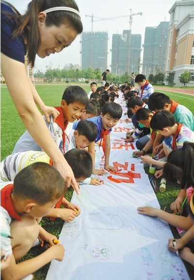 在6月5日世界环境日期间,安徽省合巢经开区胡岗小学百名学生代表在一条上书“齐向污染宣战,共享碧水蓝天”的30米长卷上签名表决心。(人民图片网供图)