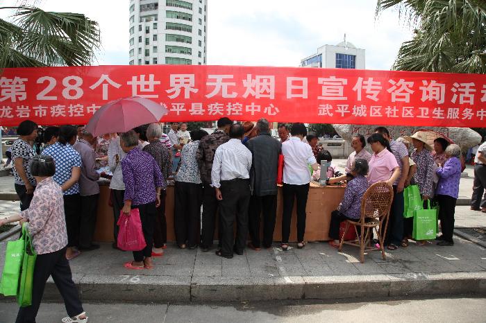 今年5月31日是第28个“世界无烟日”,我国的宣传主题是“无烟生活”。5月29日,龙岩市疾控中心、武平县卫生局等单位联合在武平县河滨客家文化公园开展世界无烟日宣传活动。工作人员积极的通过宣传单、咨询等方式向公众开展吸烟危害知识和戒烟技巧宣传,号召大家积极拒绝吸烟并劝阻他人戒烟,让我们身边,每天都是“无烟日”。此次活动共发放宣传单7种1400份,宣传袋200个,测量血压并接受群众咨询30人。闽西日报和武平电视台对活动开展情况进行了报道。