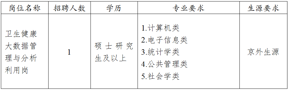 国家卫生健康委统计信息中心(以下简称“中心”)是国家卫生健康委直属的公益事业单位。根据工作需要,我中心本次公开招聘京外生源应届高校毕业生1名。现将有关事项公告如下: