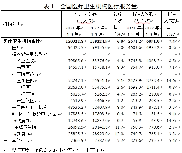 基层医疗卫生机构872.1万人次,同比增长3.3%(见表1)。
