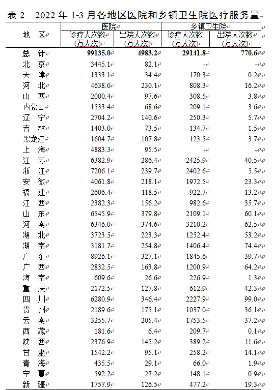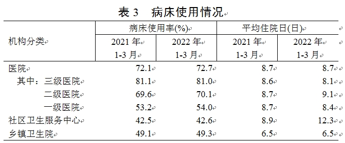 2022年1-3月,医院病床使用率为72.7%,同比提高0.6个百分点;社区卫生服务中心为42.6%,同比提高0.1个百分点;乡镇卫生院为49.3%,同比提高0.2个百分点。三级医院平均住院日为8.1日,比上年同期减少0.5日,二级医院平均住院日为9.1日,比上年同期增加0.4日(见表3)。