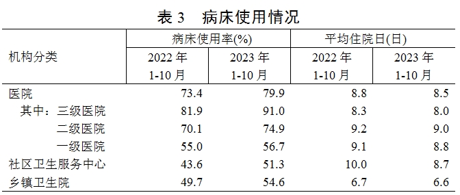 2023年1-10月,医院病床使用率为79.9%,同比提高6.5个百分点;社区卫生服务中心为51.3%,同比提高7.7个百分点;乡镇卫生院为54.6%,同比提高4.9个百分点。三级医院平均住院日为8.0日,与上年同期减少0.3日,二级医院平均住院日为9.0日,比上年同期减少0.2日(见表3)。