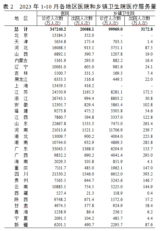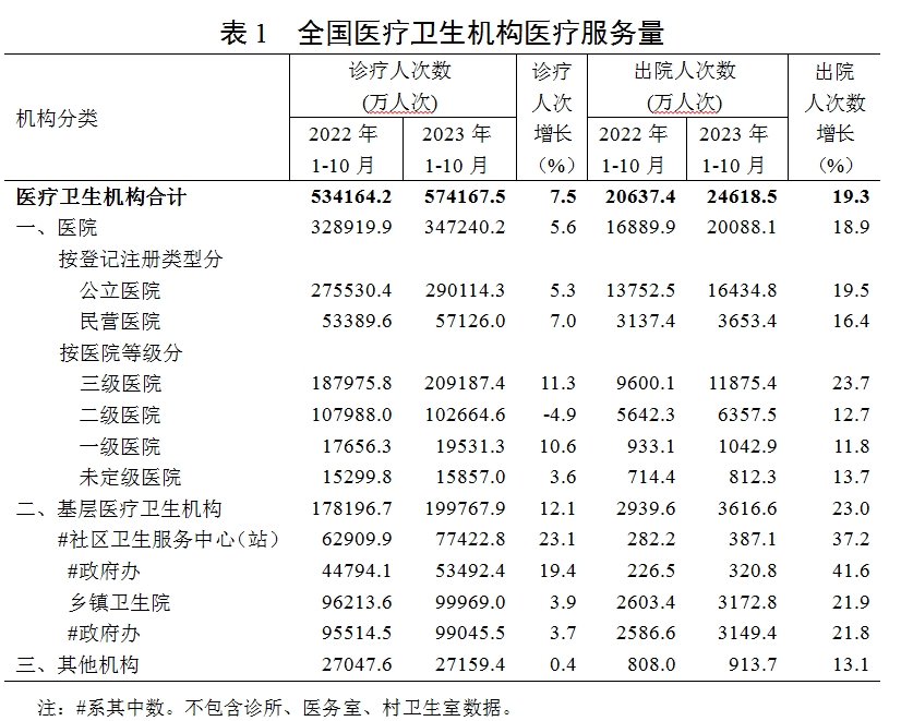 2023年1-10月,全国医疗卫生机构总诊疗人次57.4亿人次(不包含诊所、医务室、村卫生室数据),同比增长7.5%。