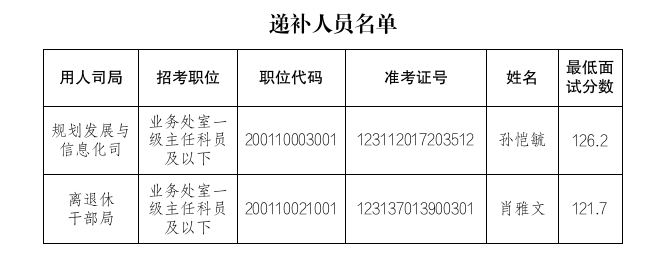根据公务员考试录用工作的有关规定,因部分考生自愿放弃面试资格,按照笔试成绩从高到低的顺序,递补以下考生作为面试人选: