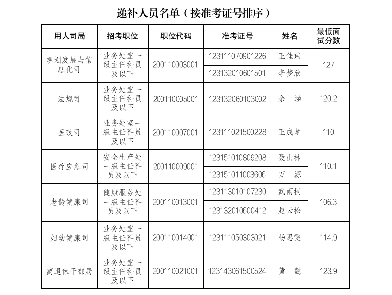 根据公务员考试录用工作的有关规定,因部分考生自愿放弃面试资格,按照笔试成绩从高到低的顺序,递补以下考生作为面试人选: