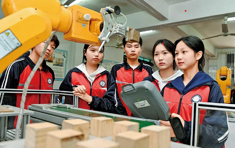 近年来,各地加强人力资源开发利用,大力发展职业教育,针对性地培育人才市场需求的专业技术人才,促进人口高质量发展。图为2024年10月29日,湖南省洞口县雪峰博雅职业技术学校,学生在练习工业机器人物品搬迁实践操作。 人民图片 滕治中/摄