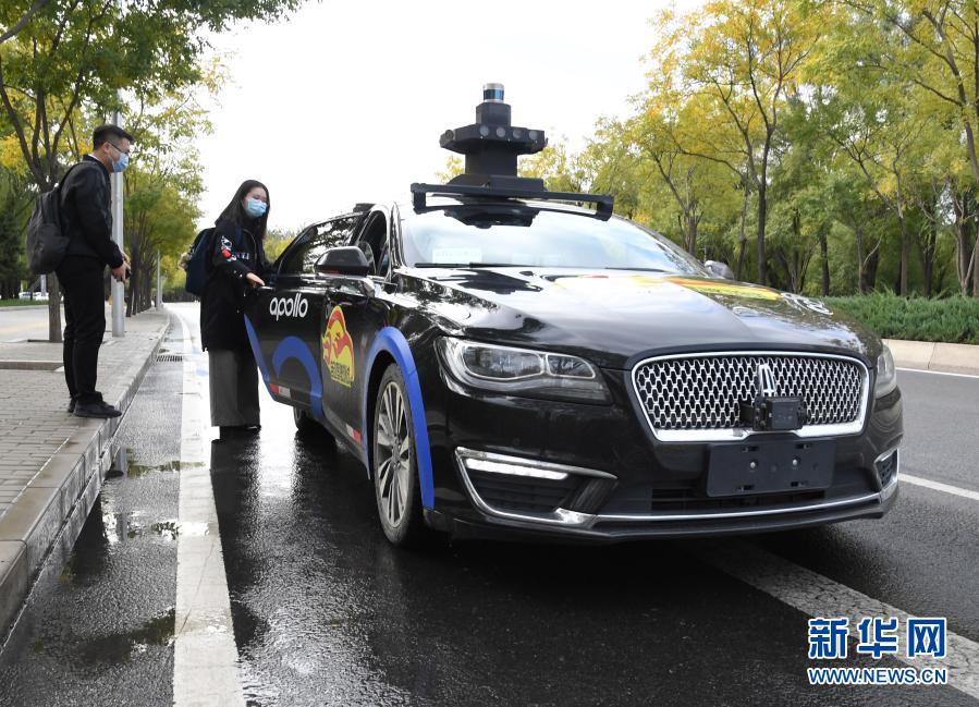 市民在北京市海淀区稻香湖路的百度自动驾驶出租车指定上车点乘车(2020年10月14日摄)