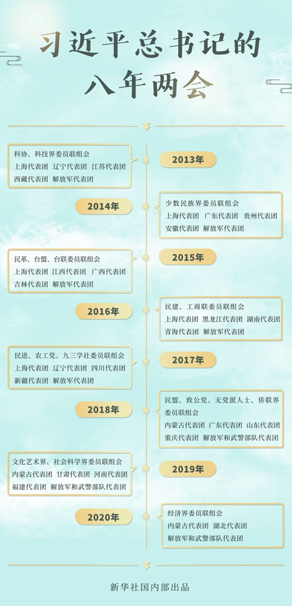 2013-2020,八年的全国两会上,总书记46次到团组参加审议讨论。交流之中,语重心长;言谈之间,发人深思。